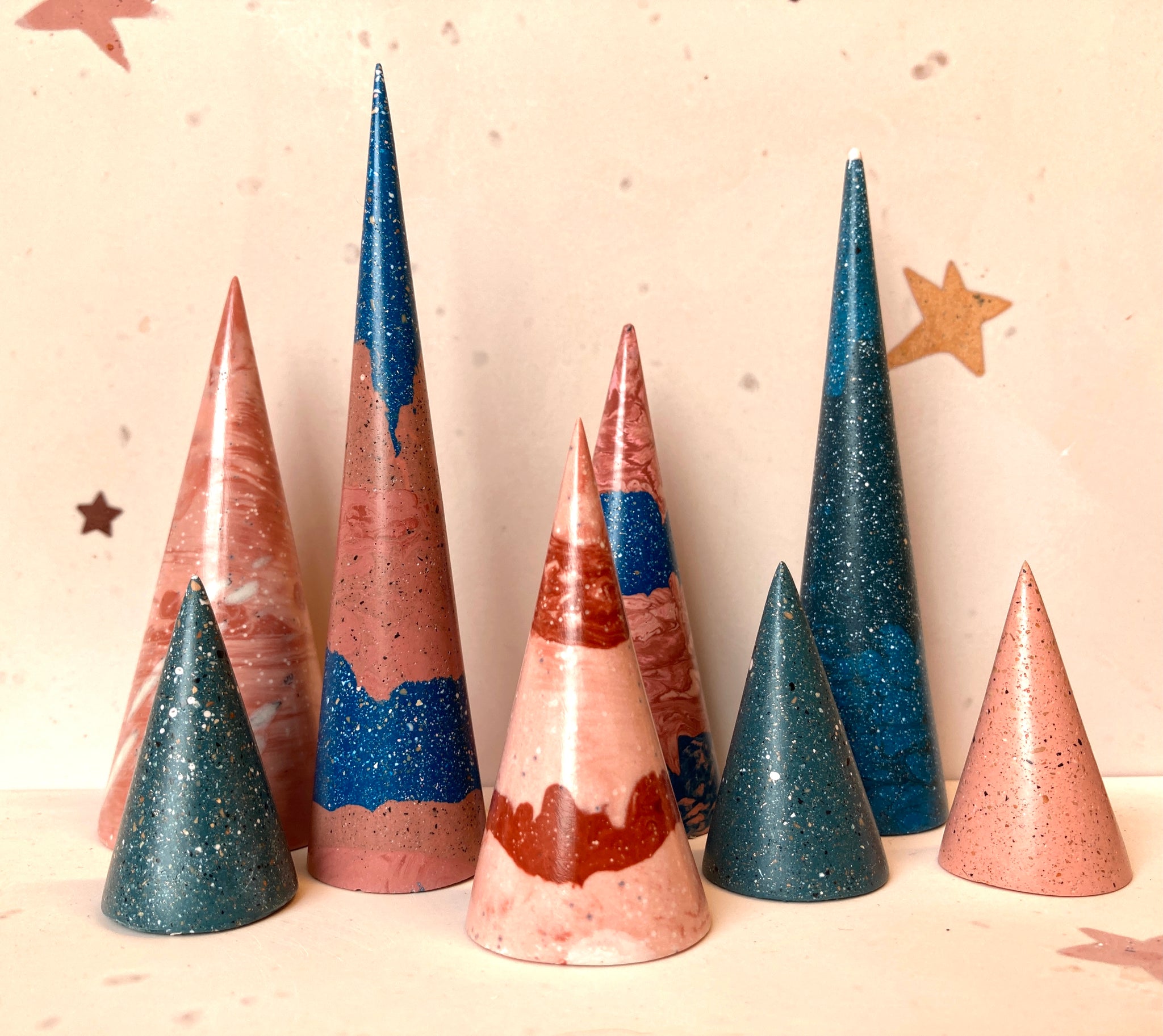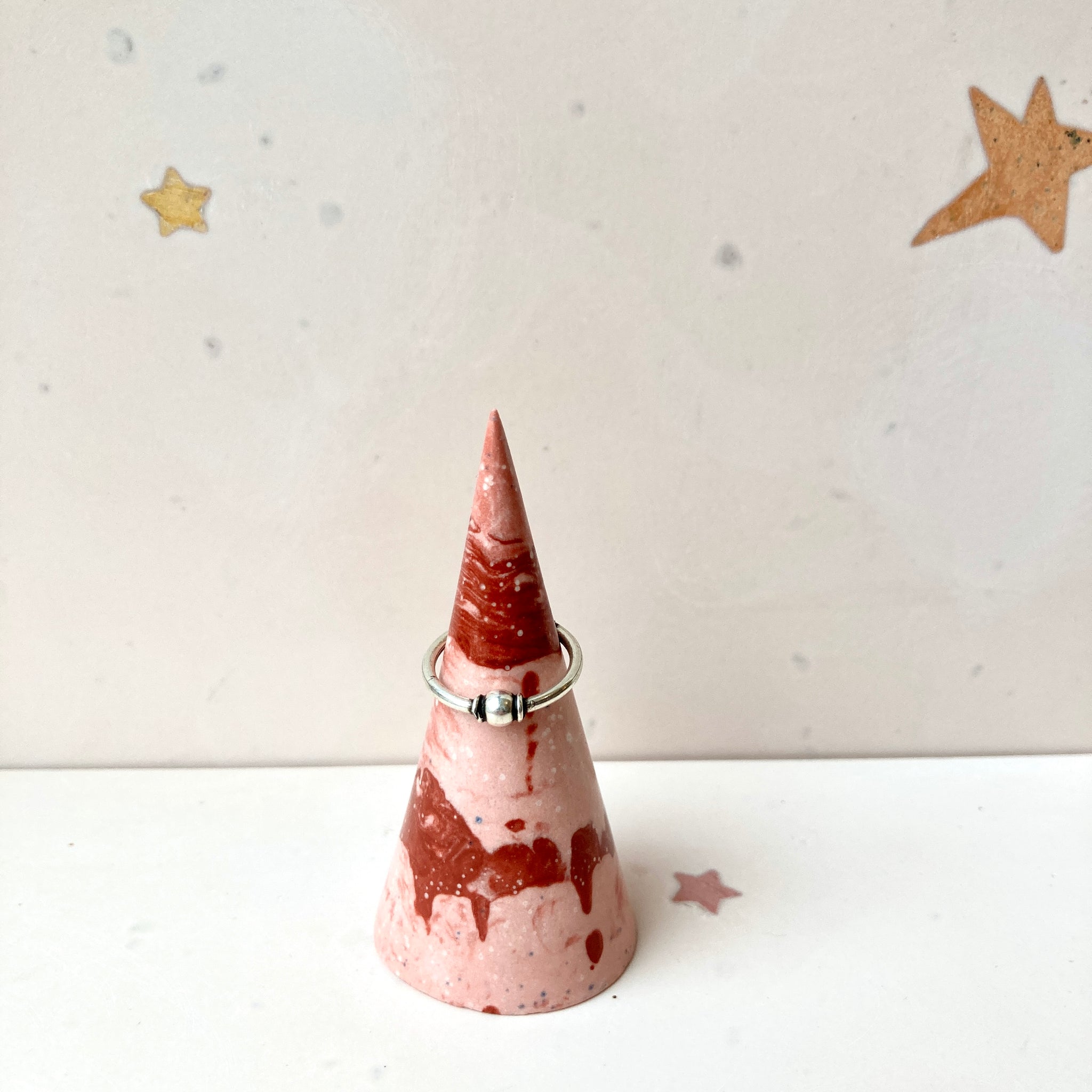 Medium pink and terracotta jewelry cone with marbled colors.